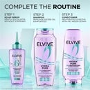 Image 4 - Image of a skincare routine featuring three LOréal Elvive products: a purple scalp serum with a tapered applicator, a bottle of shampoo, and a conditioner, all arranged against a light blue background with steps labeled as Step 1: Scalp Serum gently exfoliates without stripping, Step 2: Shampoo removes excess oil & impurities, Step 3: Conditioner rehydrates lengths with no weigh down.
