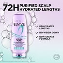 ![Image 2 - A purple conditioner bottle labeled LOreal Elvive Hydra Pure 72H Rehydrating Conditioner is shown with bubbles around it, accompanied by text stating UP TO 72H PURIFIED SCALP HYDRATED LENGTHS, REHYDRATES LENGTHS, NO WEIGH DOWN, and NON-GREASY FORMULA.