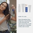 - Application: Spray throughout clean, damp hair, concentrating on the mid-shaft and ends. Do not rinse. Comb through hair to distribute evenly, style as usual.